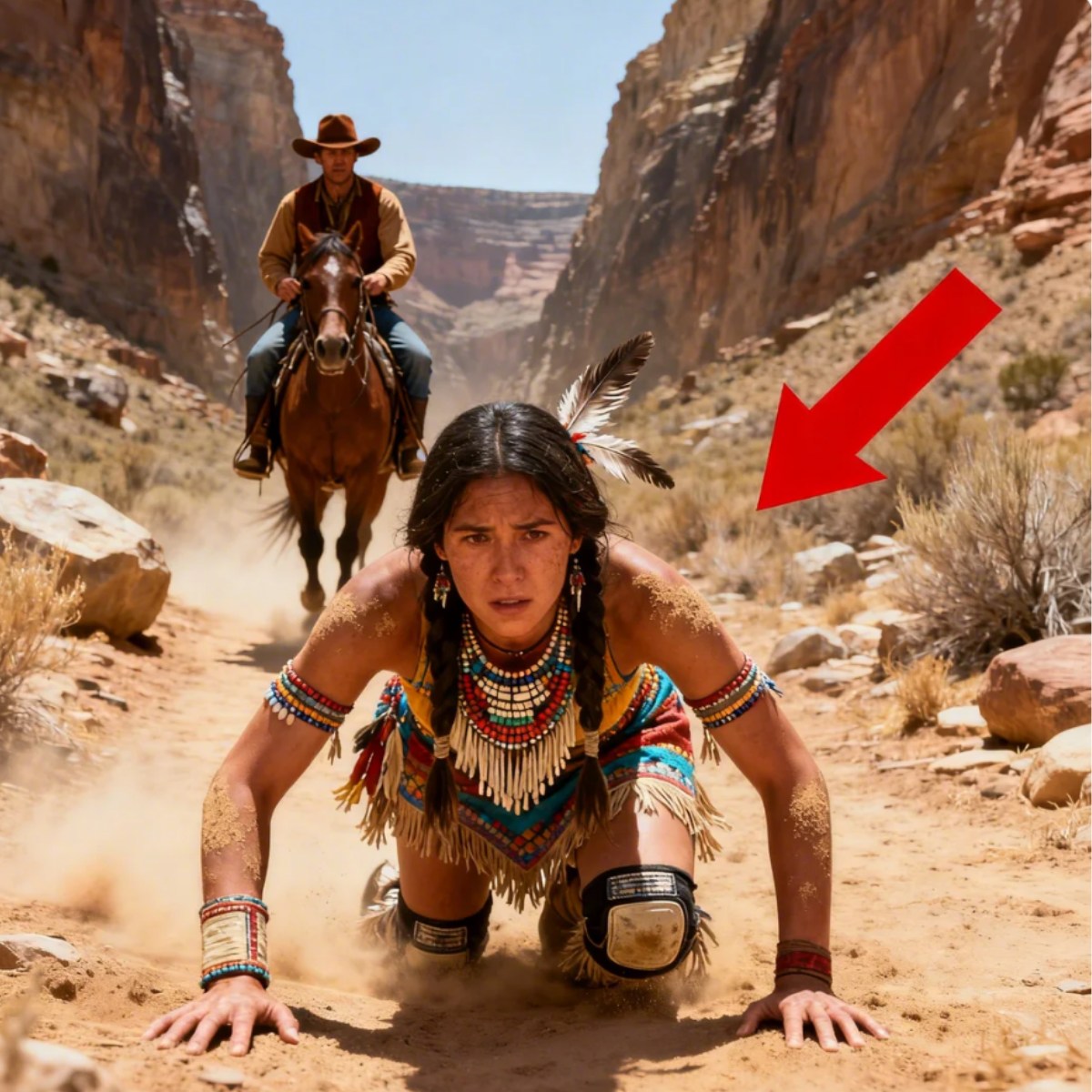 Afterward, he bought a small piece of land near Red Mesa Crossing and build a cabin by hand. He didn’t go to town often. He didn’t invite company. He worked, ate, and slept. That was all. When he heard the faint voice echo between the rocks, his first thought was that it wasn’t real. Then he saw something through the glare. movement near the ravine wall. He slowed his horse.